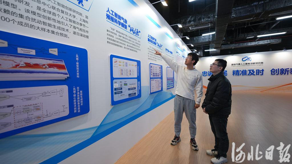 近日,在雄安气象人工智能创新研究院展示大厅,窦则胜(左)和工作人员正在探讨人工智能气象预报科学模型“风源”的迭代升级工作。河北日报记者 李畅 摄