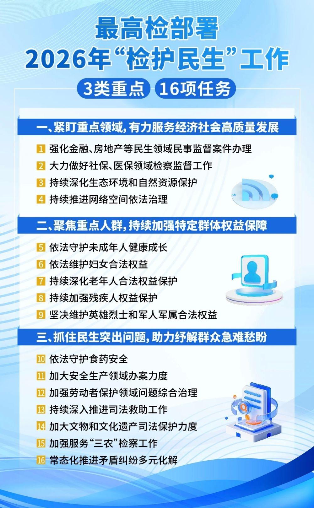 最高检明确,2026年“检护民生”工作围绕三类重点开展,即紧盯重点领域,有力服务经济社会高质量发展;聚焦重点人群,持续加强特定群体权益保障;抓住民生突出问题,助力纾解群众急难愁盼。具体为16项重点任务,分别为: