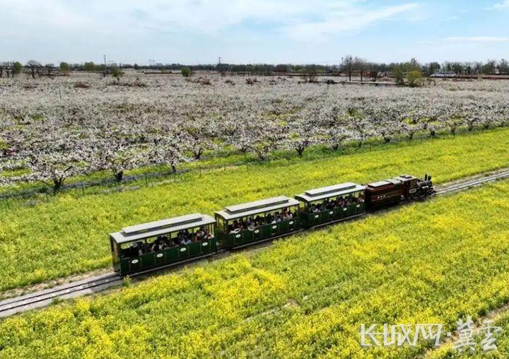 游客乘观光小火车穿梭在晋州市周家庄乡的油菜花田中。