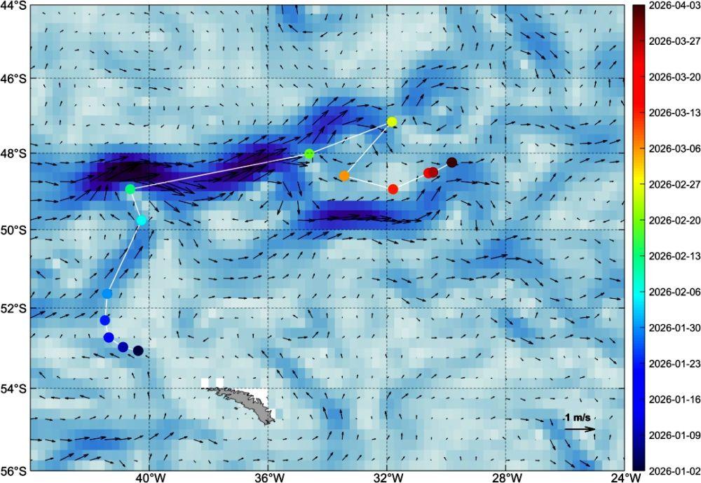 风云卫星监测的A23a冰山漂移路径(圆点为冰山位置,时间与右侧标注对应;图底色和箭头表示洋流)。