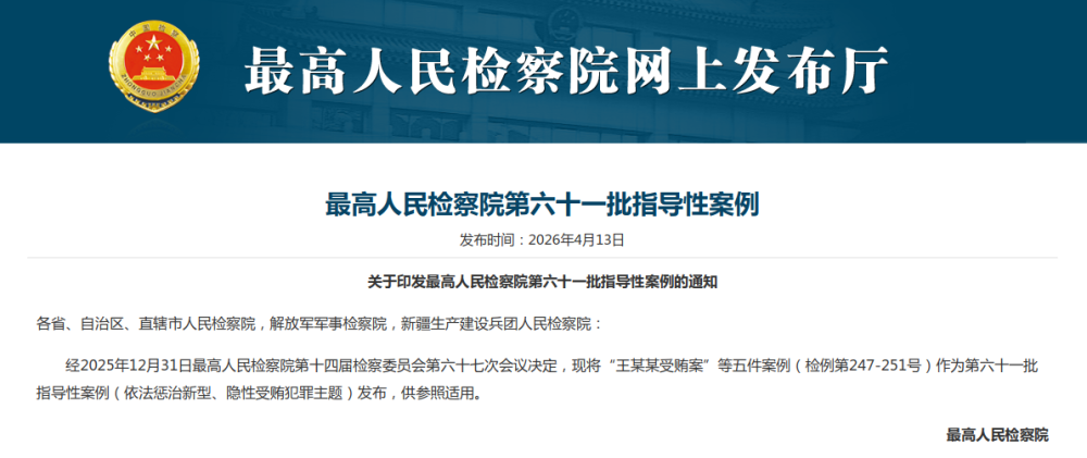 最高人民检察院4月13日公开发布第六十一批指导性案例,包含王某某受贿案等5件案例,包括虚增交易环节型受贿、放贷收息型受贿、房产交易型受贿、投资收益型受贿、原始股预期收益型受贿等5种,均是近年来多发、社会关注度较高且实践中争议较多的受贿犯罪类型。