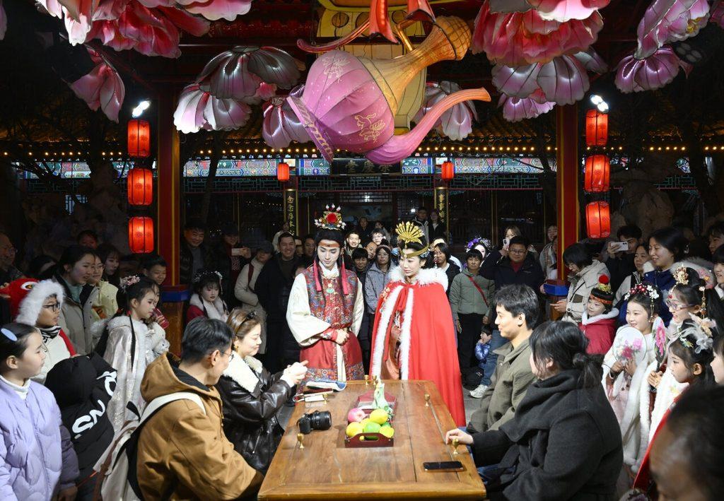 “请各位‘一梦入红楼’。”4月4日18时,正定荣国府,一片流光溢彩中,梳着长辫、留着长须的“曹雪芹”出现在景区入口。北京游客薛磊随着人流步入景区,仿佛穿越时空,翩然入梦。