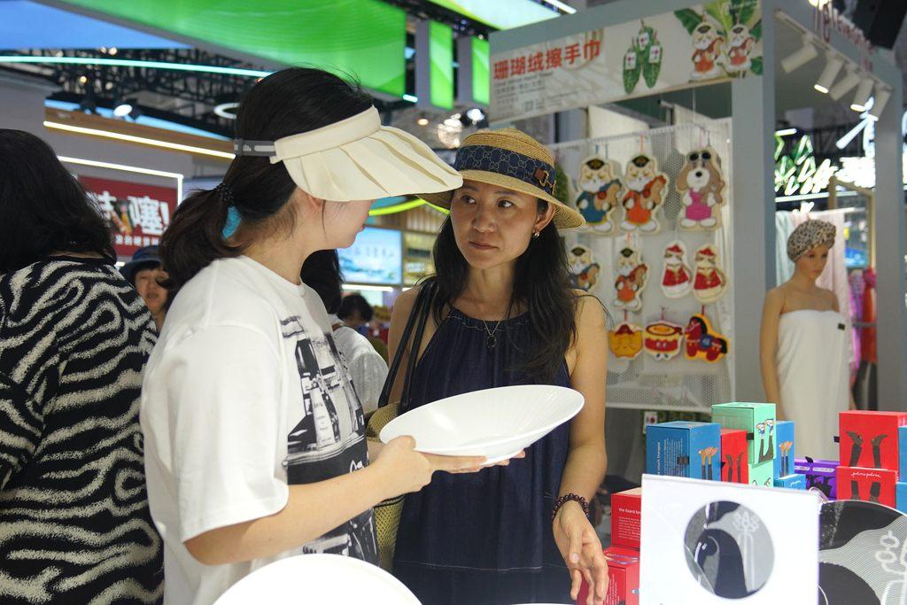 本届消博会上,纺织品是重要板块。在江苏展区,一款凉感面料制成的猫屋让顾客爱不释手:“这面料又凉快又不粘毛,太适合我家了。”在浙江展区,一款“生态感应毛巾”增加了“黑科技”,能自我感知清洁度。