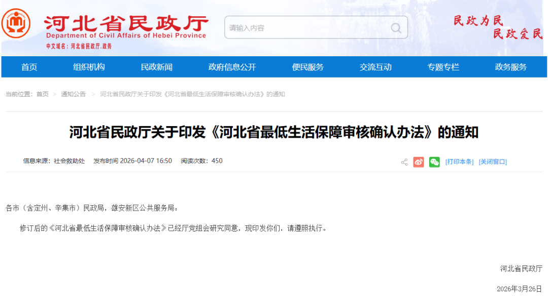 近日,省民政厅印发修订后的《河北省最低生活保障审核确认办法》(以下简称《办法》),进一步规范低保申请受理、家庭经济状况调查、审核确认及动态管理流程,为兜牢困难群众基本生活底线提供更加完善的制度保障。