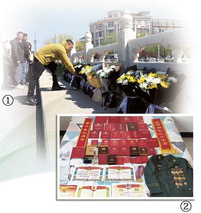 图①:河北省晋州市石津灌渠跨渠大桥上,市民献上鲜花。图②:徐闯生前的立功奖章、荣誉证书、立功喜报和军装。作者供图