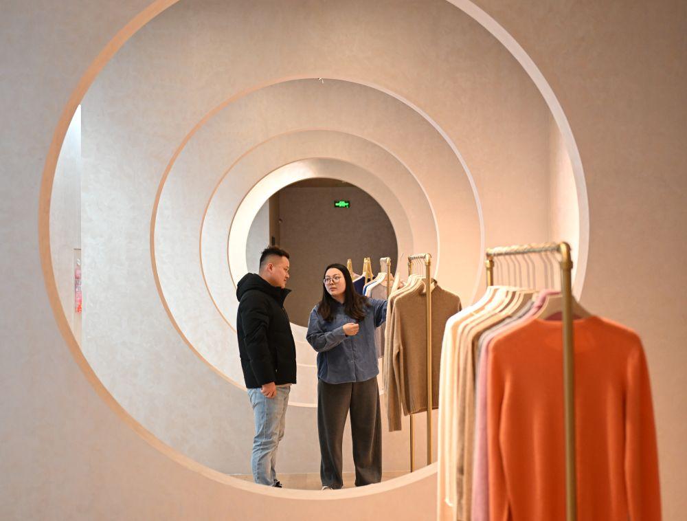 清河县一家羊绒制品生产企业的员工在展厅内为客户介绍产品 牟宇 摄