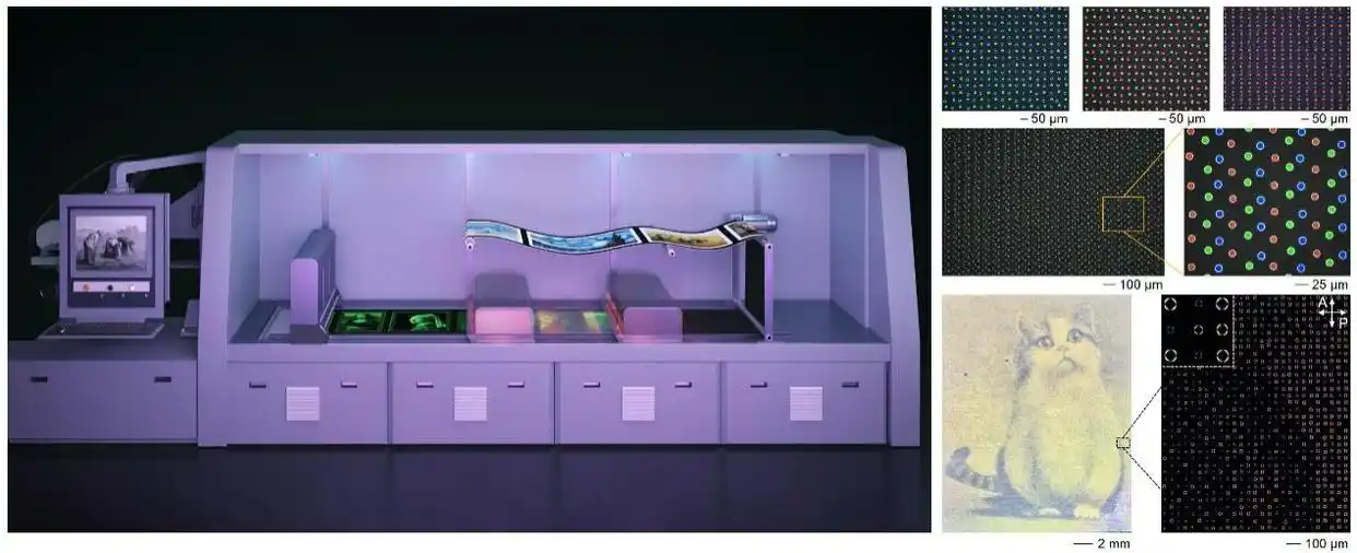针对以上技术瓶颈,研究团队首先从结构着手,创制出一种由周期性纳米晶格构成的微米尺度半球形结构,该结构通过协同光子晶格与光学界面的耦合作用,对多尺度下的光学传输行为进行精准调控,使得单元结构呈现丰富的色彩变幻,犹如万花筒般一转千色。在规模化制备方面,团队研发了高通量按需打印与卷对卷连续制造工艺,就像报纸印刷一样,将柔性基材从一个滚筒连续输送到另一个滚筒,连续完成纳米级精度打印成型,这一技术可将低成本聚合物纳米材料快速制备为单像素性能定制的光学超材料,实现跨越多个尺度的精准制造。