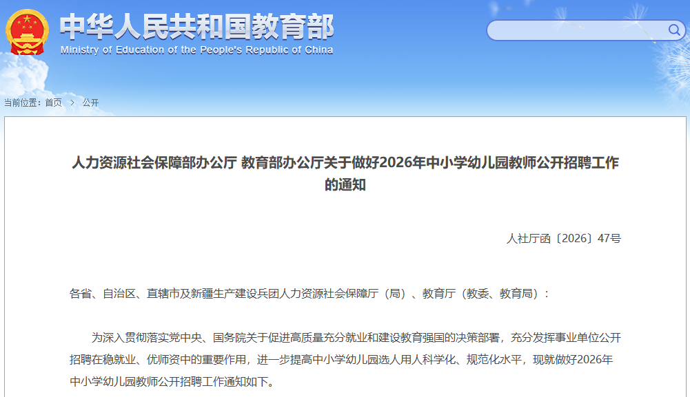 人力资源社会保障部办公厅 教育部办公厅关于做好2026年中小学幼儿园教师公开招聘工作的通知