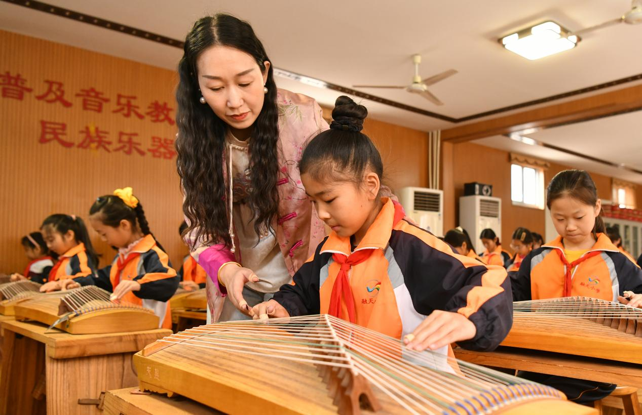 4月3日,在肃宁县融天小学,老师在国乐课上教授学生弹奏古筝。苑立伟摄