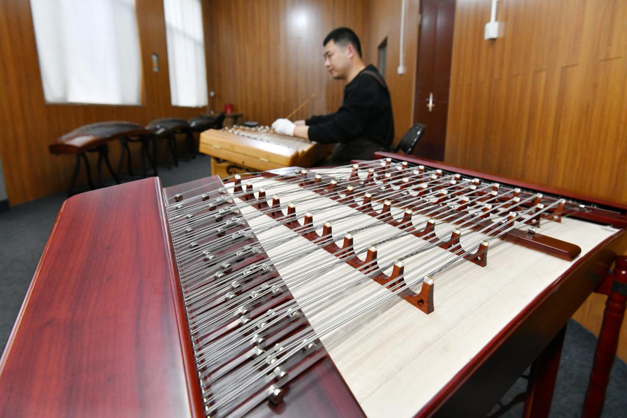 在乐海乐器生产车间,调音师正在整理调试扬琴。苑立伟摄
