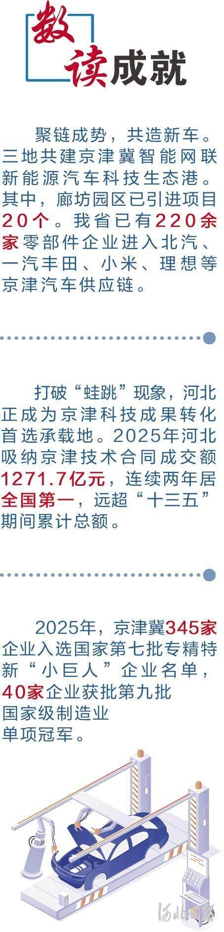 从分散布局转向协同一体,京津冀三地同握产业“方向盘”,协力共造“一辆车”。目前,三地共建京津冀智能网联新能源汽车科技生态港,在北京、天津、廊坊分别建设一个园区。其中,廊坊园区已引进项目20个。我省已有220余家零部件企业进入北汽、一汽丰田、小米、理想等京津汽车供应链。