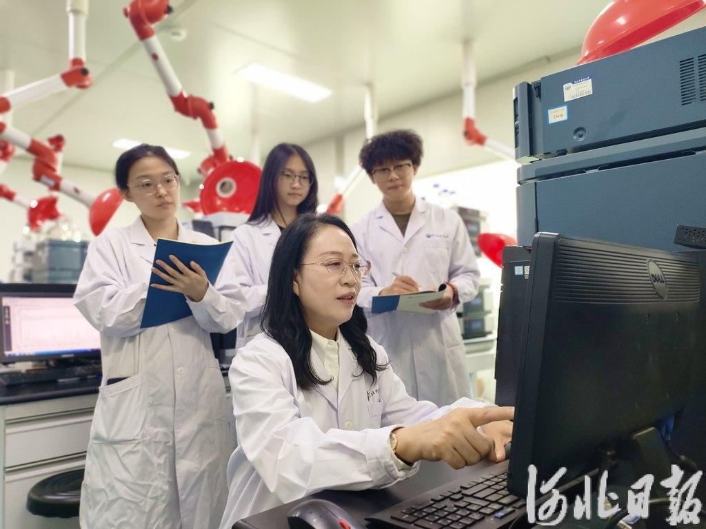 4月23日,河北中医药大学中药质量评价技术研究中心实验室,牛丽颖(前)与团队成员分析实验数据。河北日报记者 孙青 摄