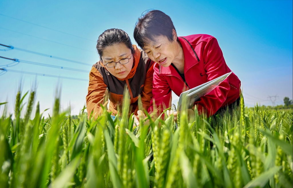 4月25日,董志平(右)在石家庄市鹿泉区一处试验田采集数据。河北日报记者 张昊 摄