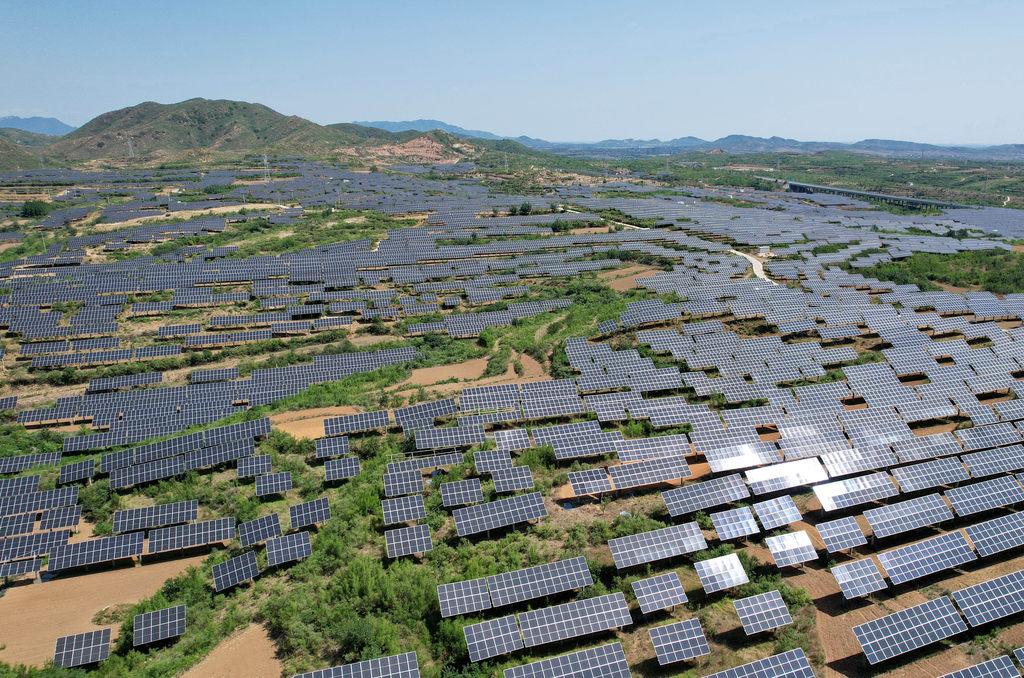 河北省赞皇县许亭镇北潘村附近的“农光互补”光伏发电场(无人机照片)。新华社发