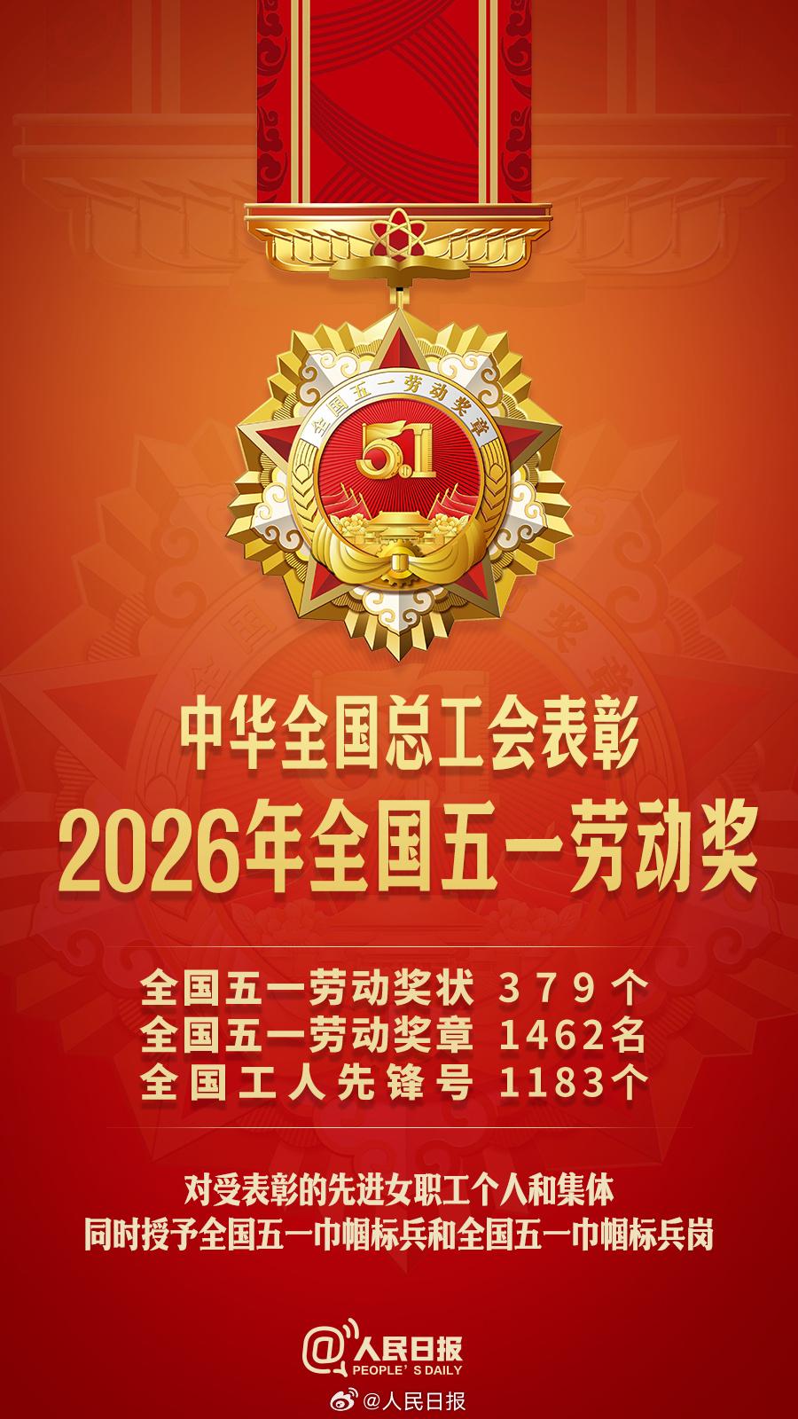 为表彰激励先进典型,凝聚起团结奋进的强大力量,中华全国总工会决定,授予北京北一机床有限责任公司等379个单位全国五一劳动奖状,授予吴勇等1462名职工全国五一劳动奖章,授予北京北斗星通导航技术股份有限公司地基云端算法团队等1183个集体全国工人先锋号,对受表彰的先进女职工个人和集体同时授予全国五一巾帼标兵和全国五一巾帼标兵岗。希望受到表彰的先进集体和个人,珍惜荣誉、保持本色,继续努力、再立新功。