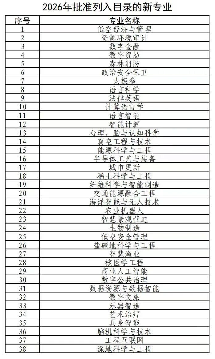 教育部今天(28日)发布《普通高等学校本科专业目录(2026年)》,共新增38种普通高校本科新专业。本次获批申办高校可纳入2026年高考招生。
