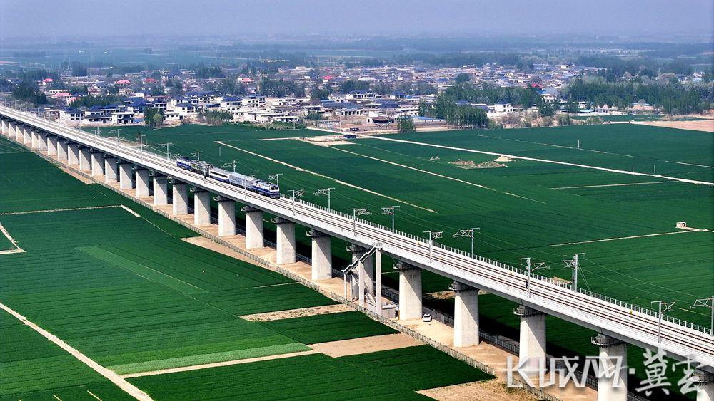 4月15日,参加联调联试雄商高铁河北段的列车通过雄商高铁任丘特大桥。新华社发