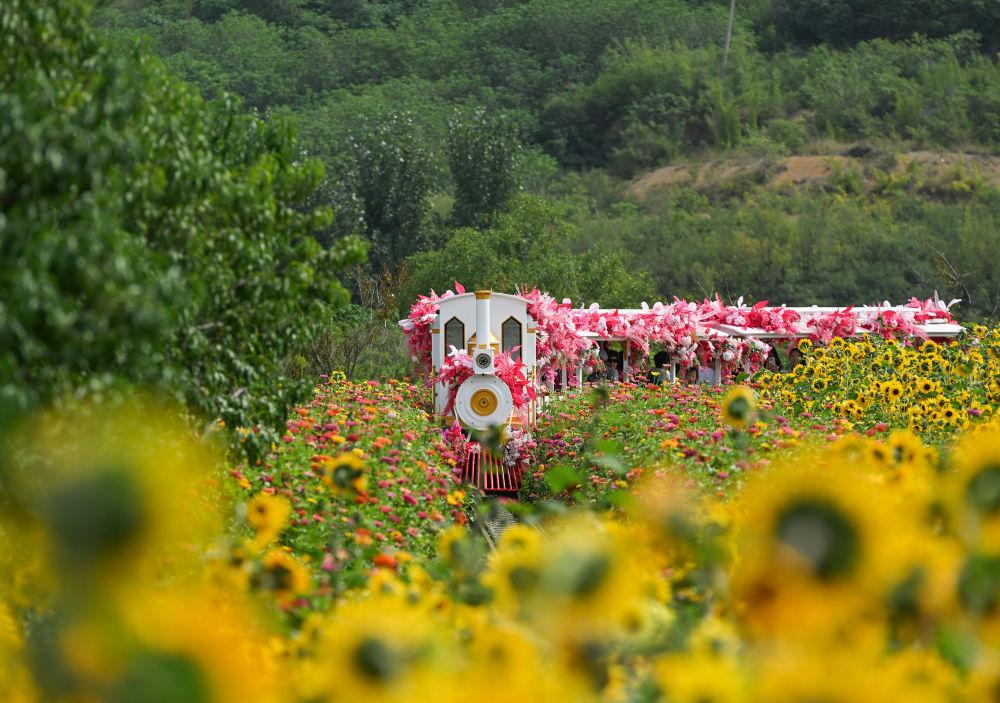 小火车穿行在邯郸市复兴区东高河村的花海中。新华社记者 赵鸿宇 摄