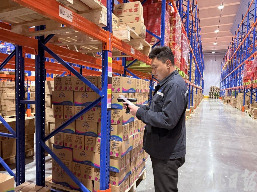 4月7日,石家庄交投集团所属冷链物流公司建设运营的国际冷链物流枢纽基地,工作人员正在检查冷库货品。河北日报见习记者 侯淼摄